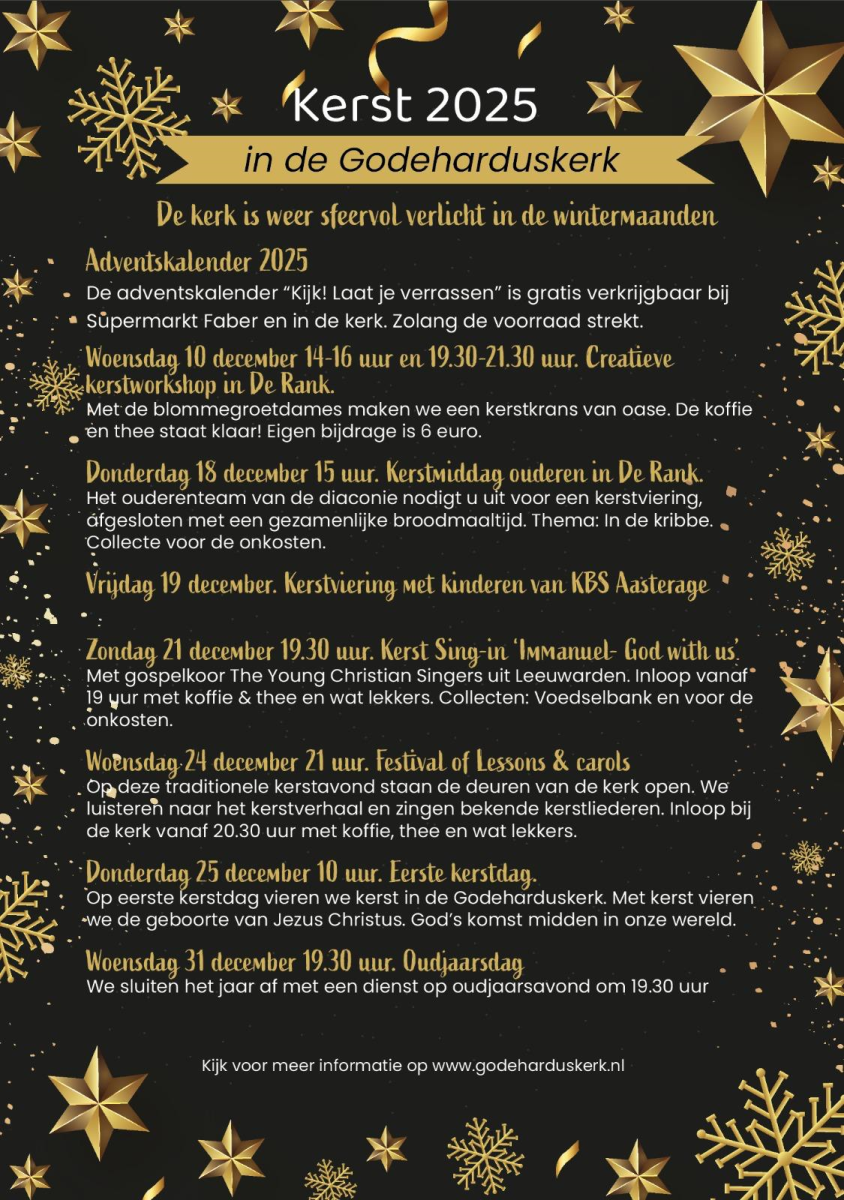De Godeharduskerk is een plek voor iedereen. Voel je welkom in de kerk, bij de GemeenteGroeiGroepen, Gebedsuur, Cantorij, Jongerengespreksgroep en ontmoetingen voor alle generaties. Kerk zijn we niet alleen op zondag, maar alle dagen van de week. Geef samen met ons, handen en voeten aan het evangelie van Christus. |